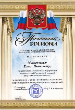 Почётная грамота Отдела образования администрации Палехского муниципального района